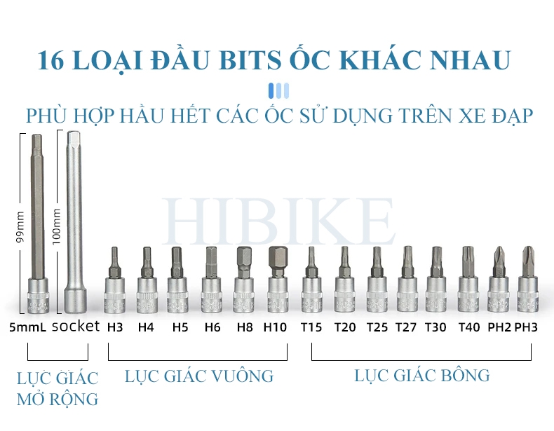 Với bộ bits đa dạng này, bạn có thể dễ dàng bảo trì và sửa chữa nhiều loại xe đạp khác nhau.