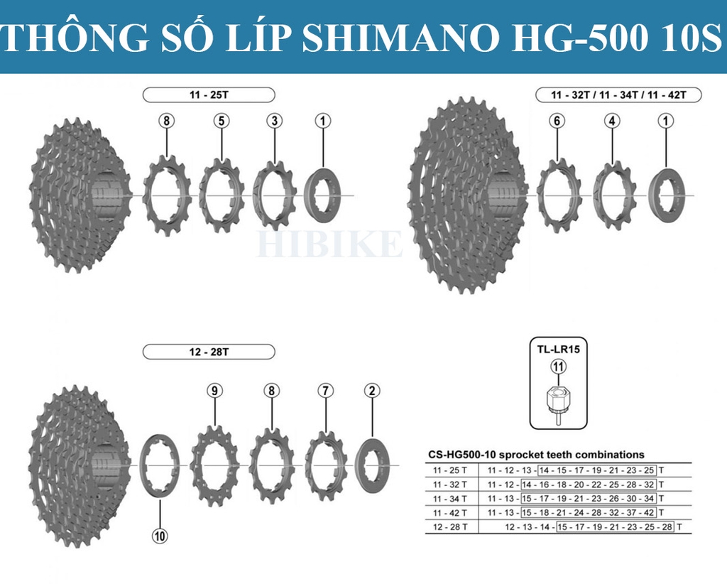 Đa dạng tùy chọn tỷ số truyền: Líp CS-HG500 có nhiều phiên bản với các tùy chọn tỷ số truyền (số răng) khác nhau, cho phép bạn lựa chọn cấu hình phù hợp nhất với phong cách đạp xe và địa hình bạn thường xuyên di chuyển. Các tùy chọn phổ biến bao gồm:
